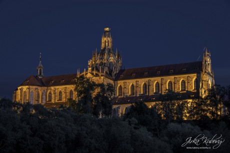 Kostel Nanebevzetí P. Marie, sv. Wolfganga a sv. Benedikta při večerním osvětlení